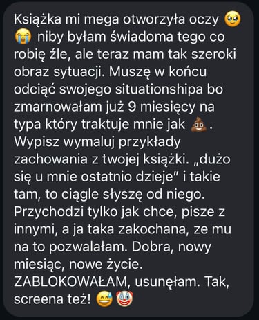 Zamiast znowu wchodzić w to samo bagno, nauczysz się, jak nie powtarzać tych samych schematów, jak ufać sobie i jak rozpoznać, kiedy coś nie jest dla Ciebie.